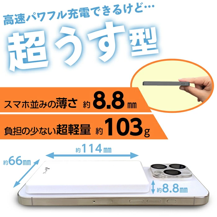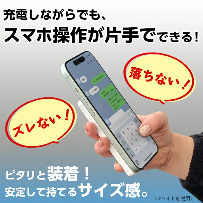 MagSafe対応でスマホの背面にピタッと吸着できるタイプなので、ケーブル不要。