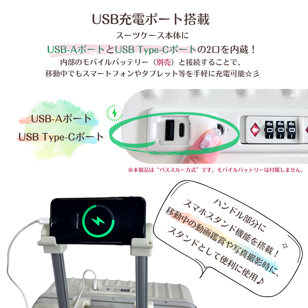 内部のモバイルバッテリー(別売)と接続すれば、移動中もサッと充電できます。