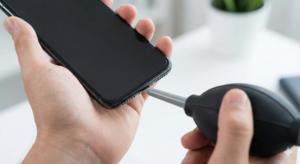 まずはケースを外します。驚くほど多くのホコリが、ケースの内側やカメラ周りの縁に溜まっているはずです。これこそが、本体を傷つける「隠れた敵」です。ケースを外したら、まずはブロアーを使って、本体全体、特に充電ポートやスピーカー穴、マイク穴、サイレントスイッチの隙間などのホコリを吹き飛ばします。息を吹きかけるのは、唾液が飛んで内部に入り込み、腐食の原因になるため絶対にやめましょう。