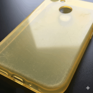TPU素材によくある仕様ですが、これはプラスチックに含まれる酸化防止剤が起こす化学変化によって発生します。おおよそ数カ月から半年程度で劣化が始まり、あんなにきれいだったスマホケースが気づいたら薄く汚れて見えるように…なんてことも起きてしまいます。