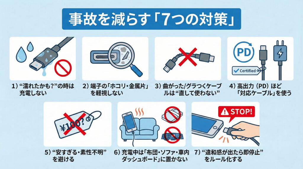 - 再使用しない:原因特定前に同じケーブル・充電器を使わない