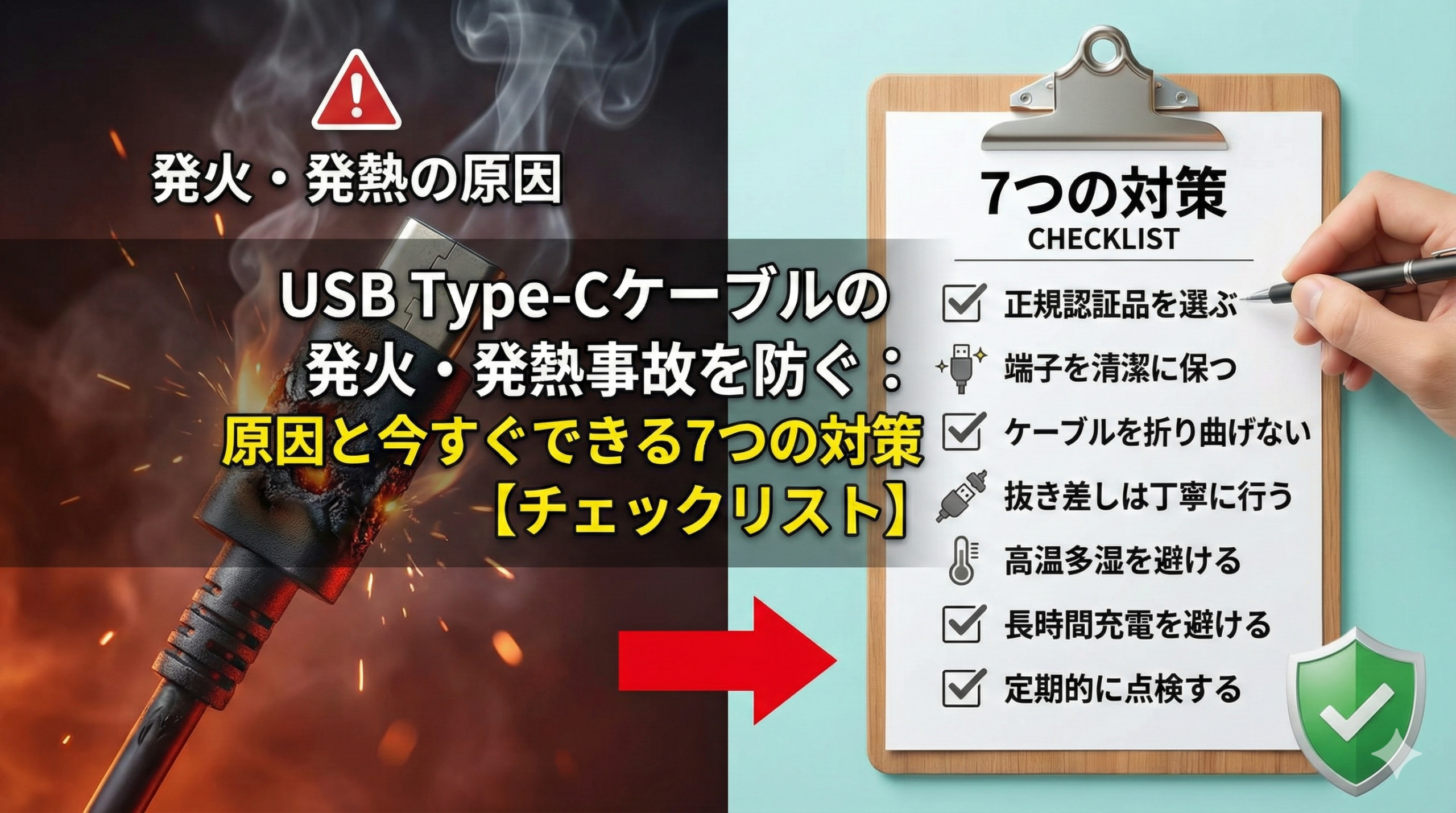 この記事の要点:Type-C発火事故の主因は「異物・水分」「変形・接触不良」「粗悪ケーブル」「高出力充電のミスマッチ」。安全なケーブル選び、端子清掃、NG行動、緊急時対応までチェックリストで解説します。