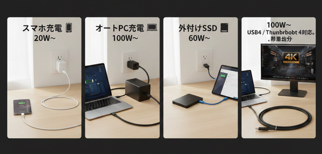 | 迷ったらこれ! | 100W〜 | 可能 | USB4 / Thunderbolt 4対応。高価だけど最強の1本。 |